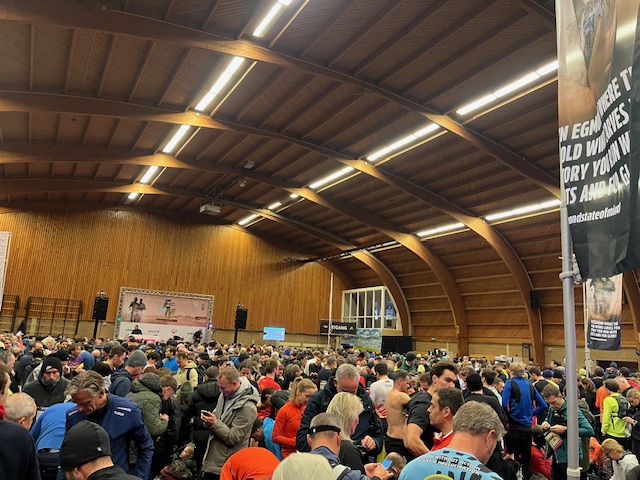 In Egmond zoek ik eerst de sporthal op. Mijn outfit-of-the-day bestaat uit een lange broek, hardloopshirt met daaroverheen een hardloopjas. Zo denk ik de wind buiten de deur te houden. Echter de sporthal is naar mijn mening veel te druk. Echt nul ruimte om je om te kleden. Ik zit voor mijn gevoel met mijn linkerarm in een man met een geel hardloopshirt in zijn nek. En met mijn rechterarm raak ik een vrouw aan die loopt te klagen dat ze haar muziek niet aankrijgt. Gauw uit deze volle zaal, echter moet je jezelf dan ook weer door een mensenmassa persen. Buiten lever ik mijn tas in en ga nog even naar het toilet. Nog nooit heb ik bij een evenement zoveel toiletten gezien: top!