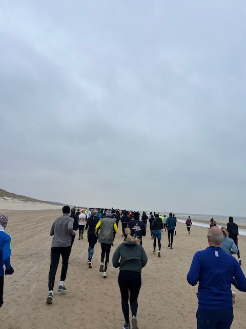 Bij de start bedenk ik mij opeens: “shit ik heb mijn tepels niet afgeplakt.” Mede hardlopers weten hoe pijnlijk dat kan zijn. Geen tijd of zin om meer terug te gaan. In het vak doet iedereen op zijn of haar manier de warming-up. In beweging blijven is toch wel verstandig. Om 12:35 worden we weggeschoten. Net als voor de wedstrijd hoor ik ook hier weer Daddy Cool van Boney M. Ja bij -4 over het strand rennen: I’m crazy like a fool.